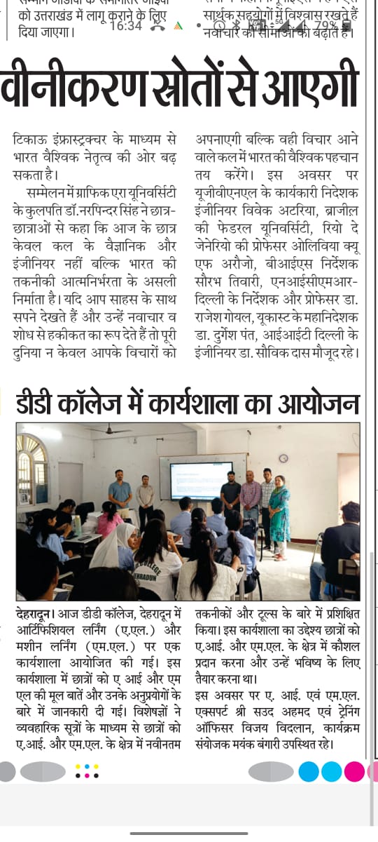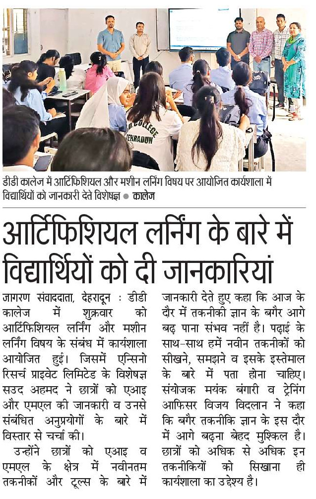 देहरादून: डीडी कॉलेज में आर्टिफ़िशियल इंटेलिजेंस (एआई) और मशीन लर्निंग (एमएल) पर वर्कशॉप आयोजित की गई। सत्र में विद्यार्थियों को बताया गया कि एआई-एमएल कैसे काम करते हैं और रोज़मर्रा की ज़िंदगी तथा विभिन्न उद्योगों में इनका उपयोग किन-किन क्षेत्रों में हो रहा है।